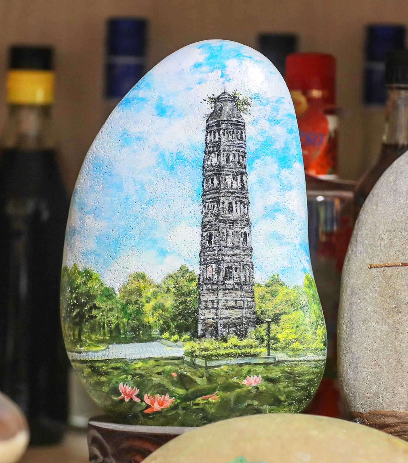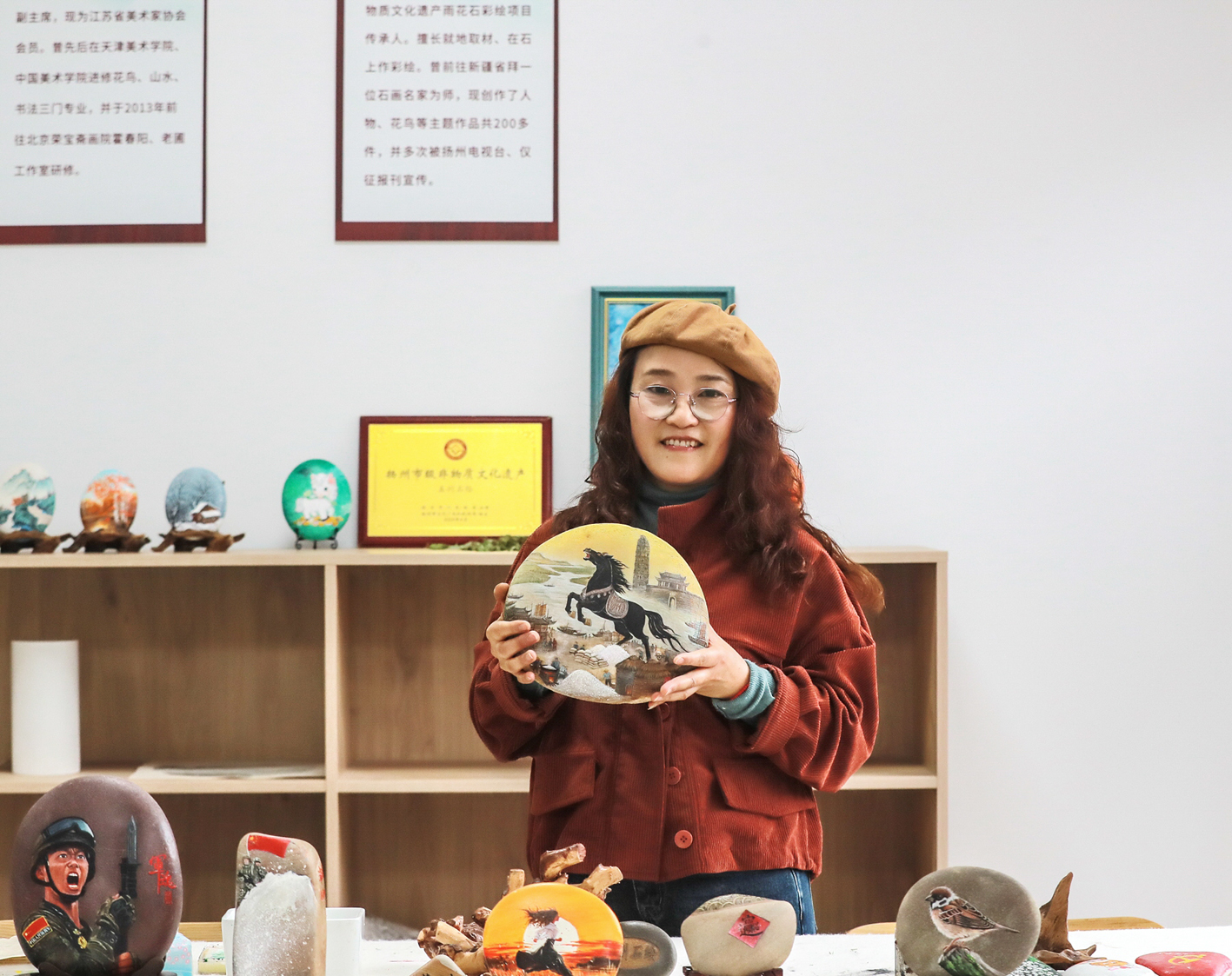 真州石绘依托仪征本地雨花石、鹅卵石等天然石材,因材施艺、随形赋画。刘燕深耕石绘技艺十余载,从选石构思、精细勾勒到上色封层,每一步精益求精。在她的笔下,人物、生肖、民俗、城市地标、运河风光等题材跃然石上,一石一画、件件孤品。2024年,“真州石绘”正式列入扬州市非物质文化遗产代表性项目名录,刘燕成为这一技艺传承发展的核心力量。