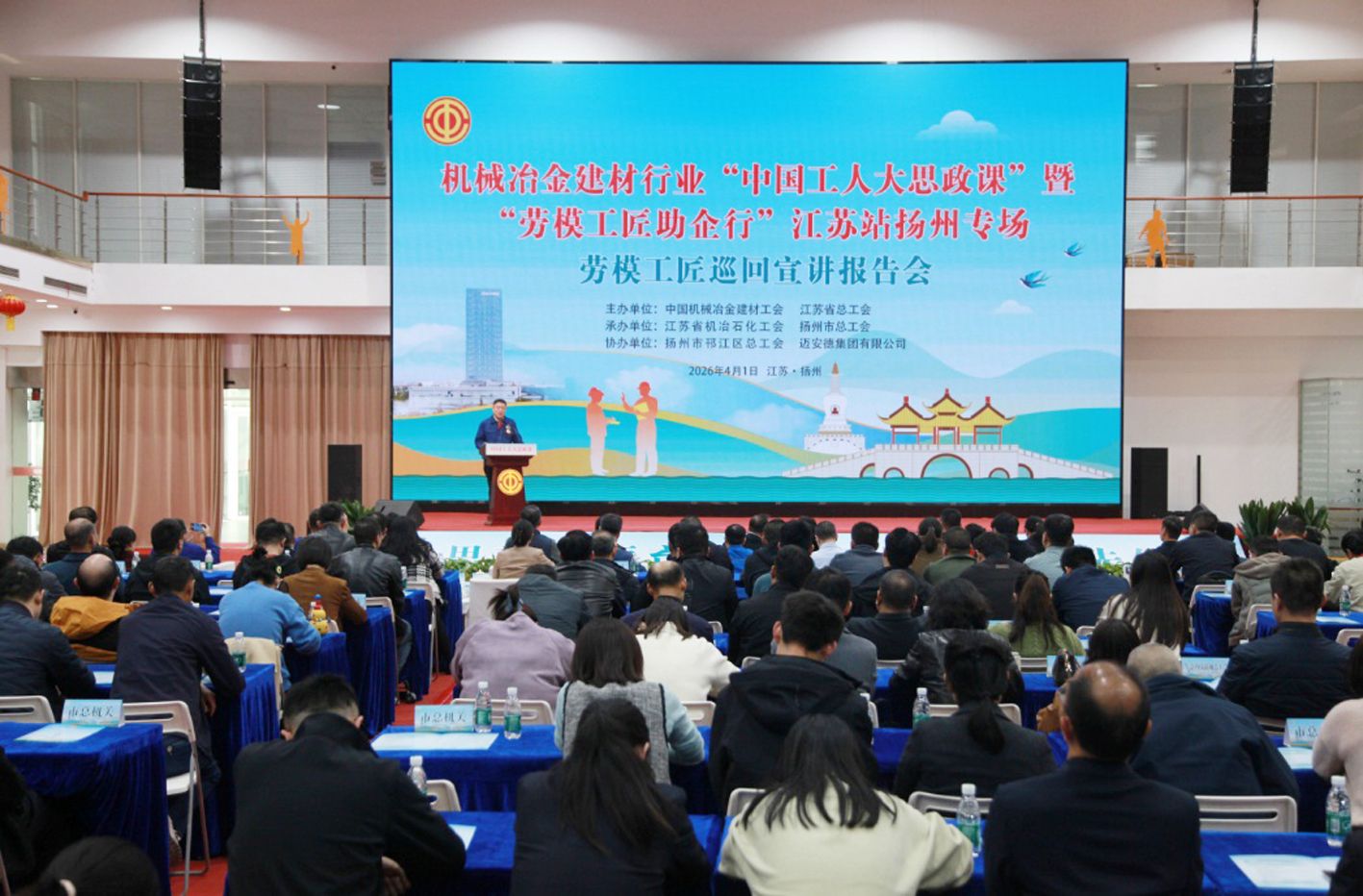 4月1日,机械冶金建材行业“中国工人大思政课”暨“劳模工匠助企行”江苏站走进扬州。8位来自全国机械冶金建材行业的劳模工匠齐聚扬城,上午深入企业车间“把脉问诊”,下午登台讲述奋斗故事,以“技术+思政”双重赋能,为扬州产业工人队伍建设改革注入强劲动能。本次活动由中国机械冶金建材工会、江苏省总工会主办,江苏省机冶石化工会、扬州市总工会承办,并通过新华网、江苏工会服务网同步直播,线上观看人数超过380万人次。