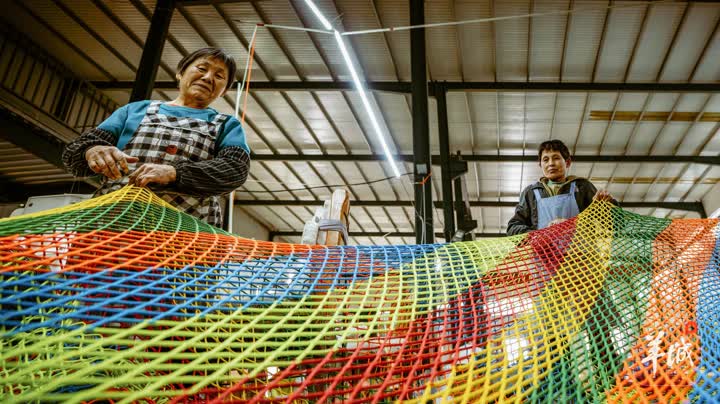 中国(滨州)绳网产业新城赋能中心车间内,一根根绳编织成网