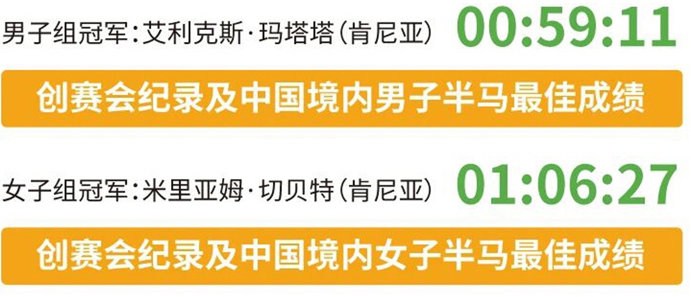在强劲阵容加持下,男女选手双双刷新赛会纪录,并打破中国境内半马最好成绩,尽显硬核竞技实力: