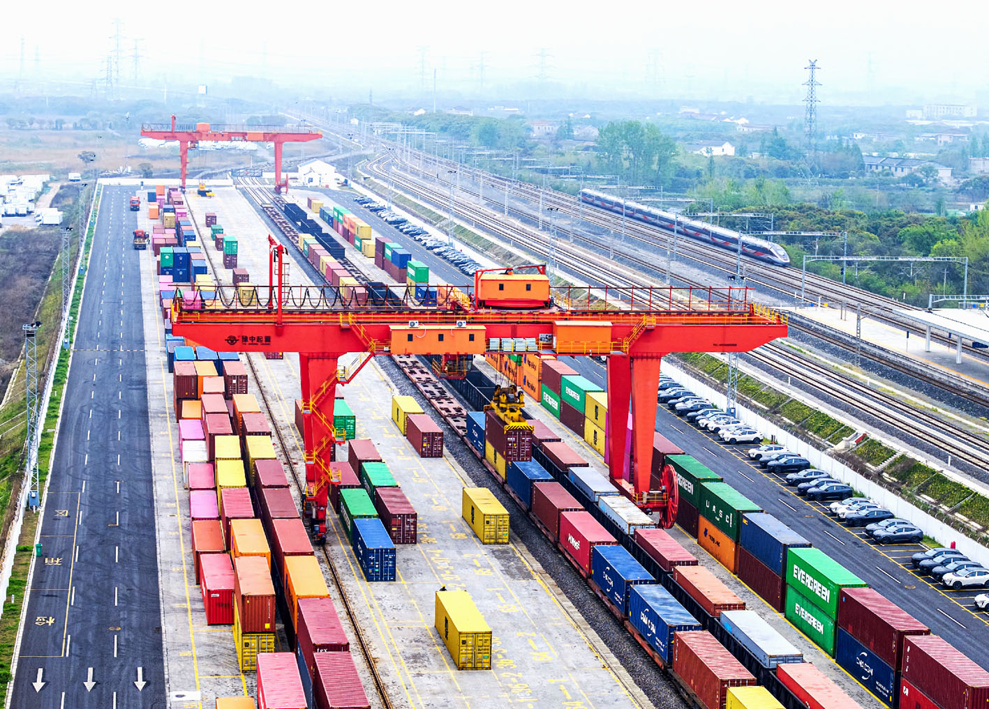 近日,海关总署发布数据显示,2026年一季度我国货物贸易进出口总值11.84万亿元,同比增长15%,季度规模首超11万亿元的同时,季度增速创近5年最高。图为在南京铁路物流中心江都物流基地内,大型起重设备将集装箱吊装到海铁联运列车,准备出口。