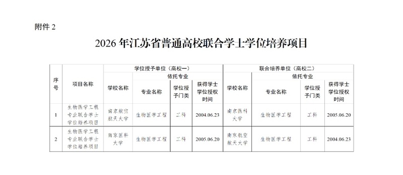 而联合学士学位培养项目为南京航空航天大学与南京医科大学联合开展的生物医学工程专业联合学士学位培养项目。两校生物医学工程专业均具备长期学士学位授权资质,依托工科与医学优质资源协同育人,推动医工交叉深度融合,提升生物医学工程领域人才培养水平。