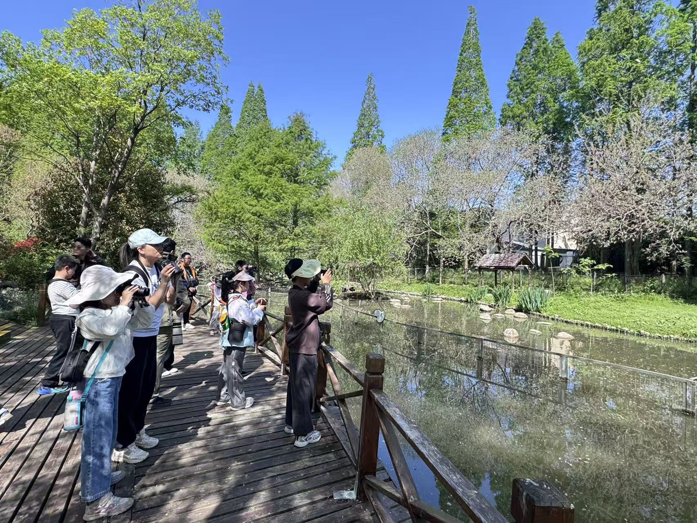 沿着景区指定的观鸟路线,小记者们在茱萸湾工作人员和金老师的带领下,安静而专注地观察着水边和林间的鸟类。白鹭优雅地立在浅水中,白头鹎在枝头跳跃,远处还有几只夜鹭静静等待猎物。