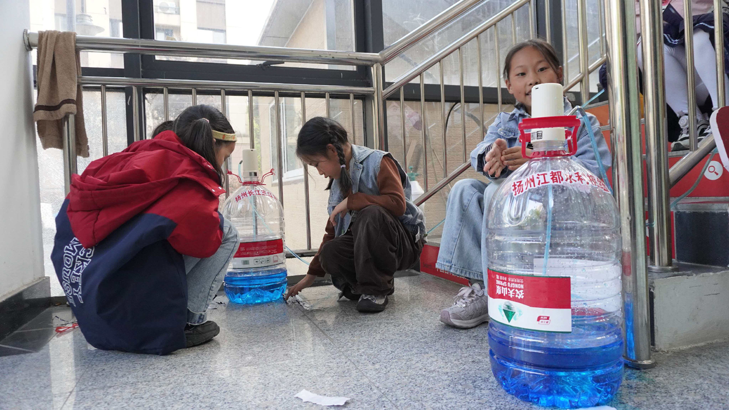 活动现场,扬州市江豚保护协会、扬州工业职业技术学院江豚保护协会的志愿者,带领25名自主报名的扬州小朋友,沉浸式体验南水北调东线输水全过程。现场准备了纯净水桶、水管、抽水机等道具,志愿者在水桶上张贴长江三江营、江都水利枢纽、洪泽湖等标识,以水桶代表泵站和水源地(含水库、湖泊),用水管去连接各级泵站;水桶顶部设置抽水机开关,并借助现场楼梯,直观演绎南水北调逐级提水的作业情形……