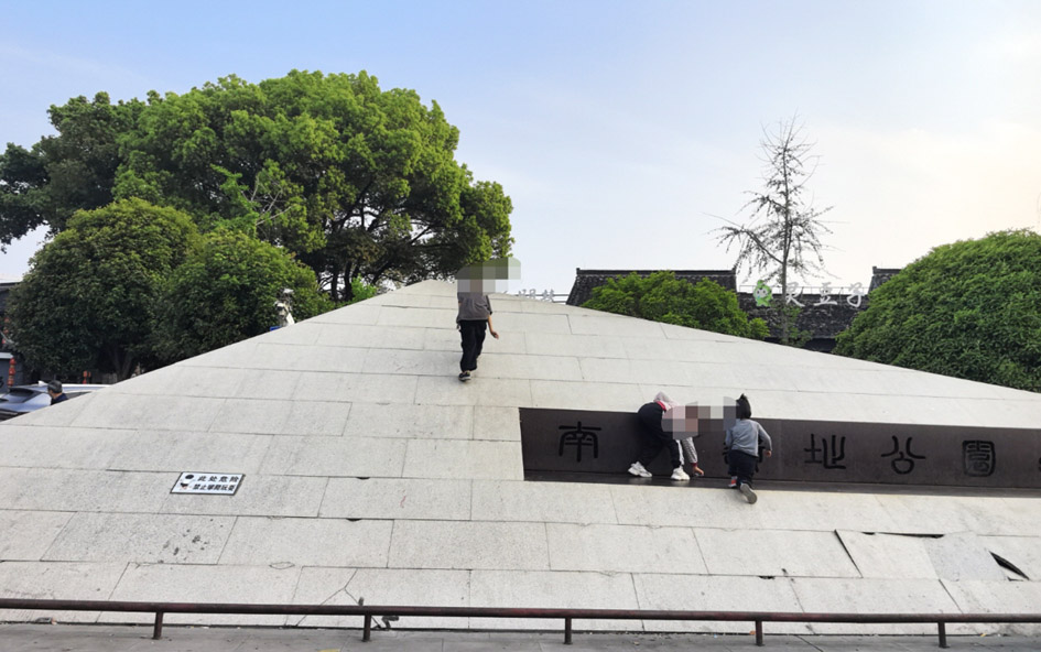 “南门遗址公园内的金字塔式建筑,建筑侧面是斜坡式的,有孩子把它当成了滑梯,爬上去之后滑下来,来回多次。”网友表示,这处斜坡式建筑下面就是金属栏杆,万一从上面冲下来脚不稳,很容易栽下来撞到头,安全隐患很大,希望家长能起到监护作用,同时希望管理部门能禁止孩子们在此处攀爬。