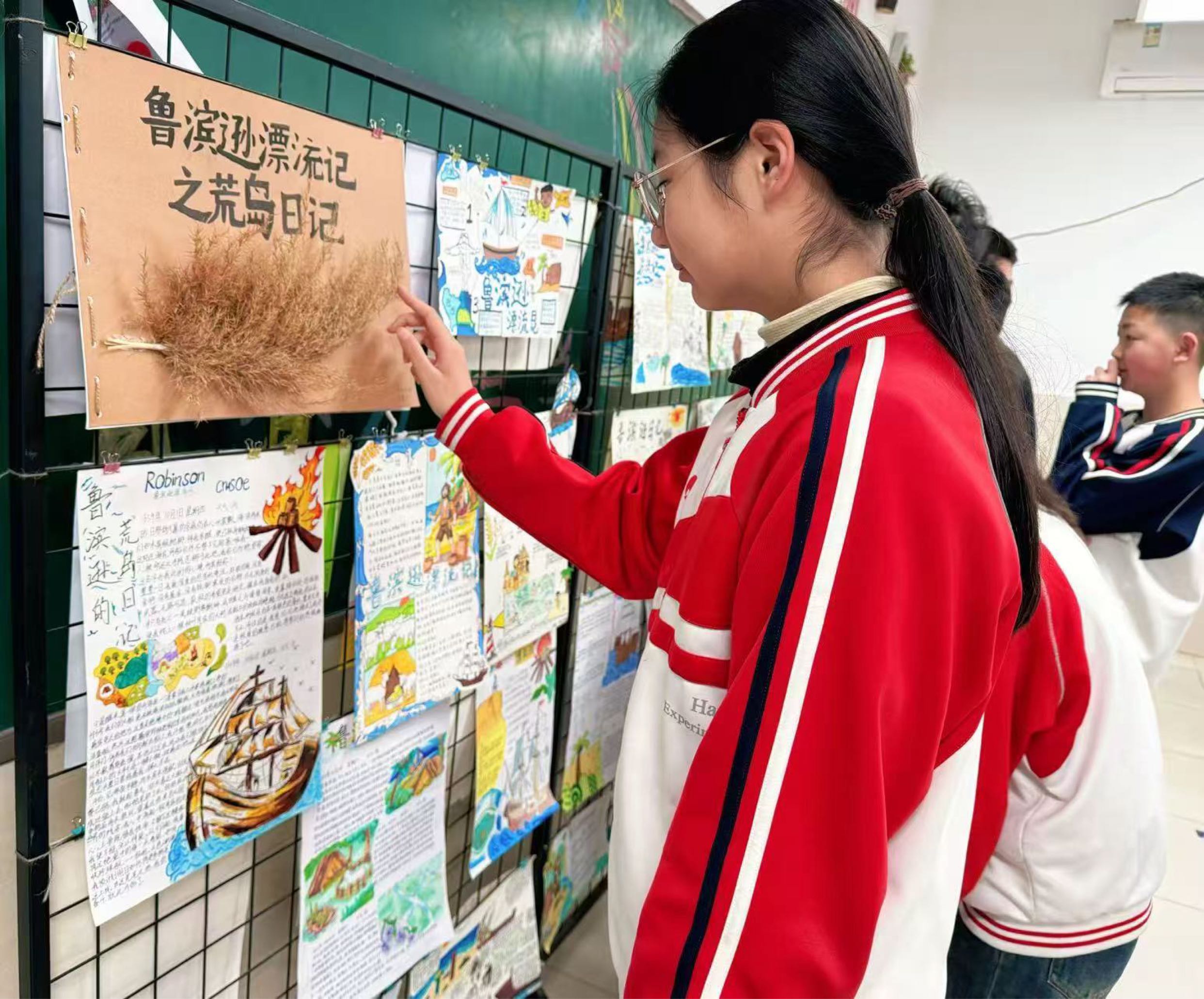记者在现场看到,六年级的教室变身“荒岛生存主题展”,一本本手工装订的“荒岛日记”大小不一、材质各异。侯清筠同学的作品吸引了多位参观者驻足。她以第一人称撰写了多篇“荒岛日记”,从船难落水、搭建避难所到尝试造船逃离,情节连贯且细节丰富。
