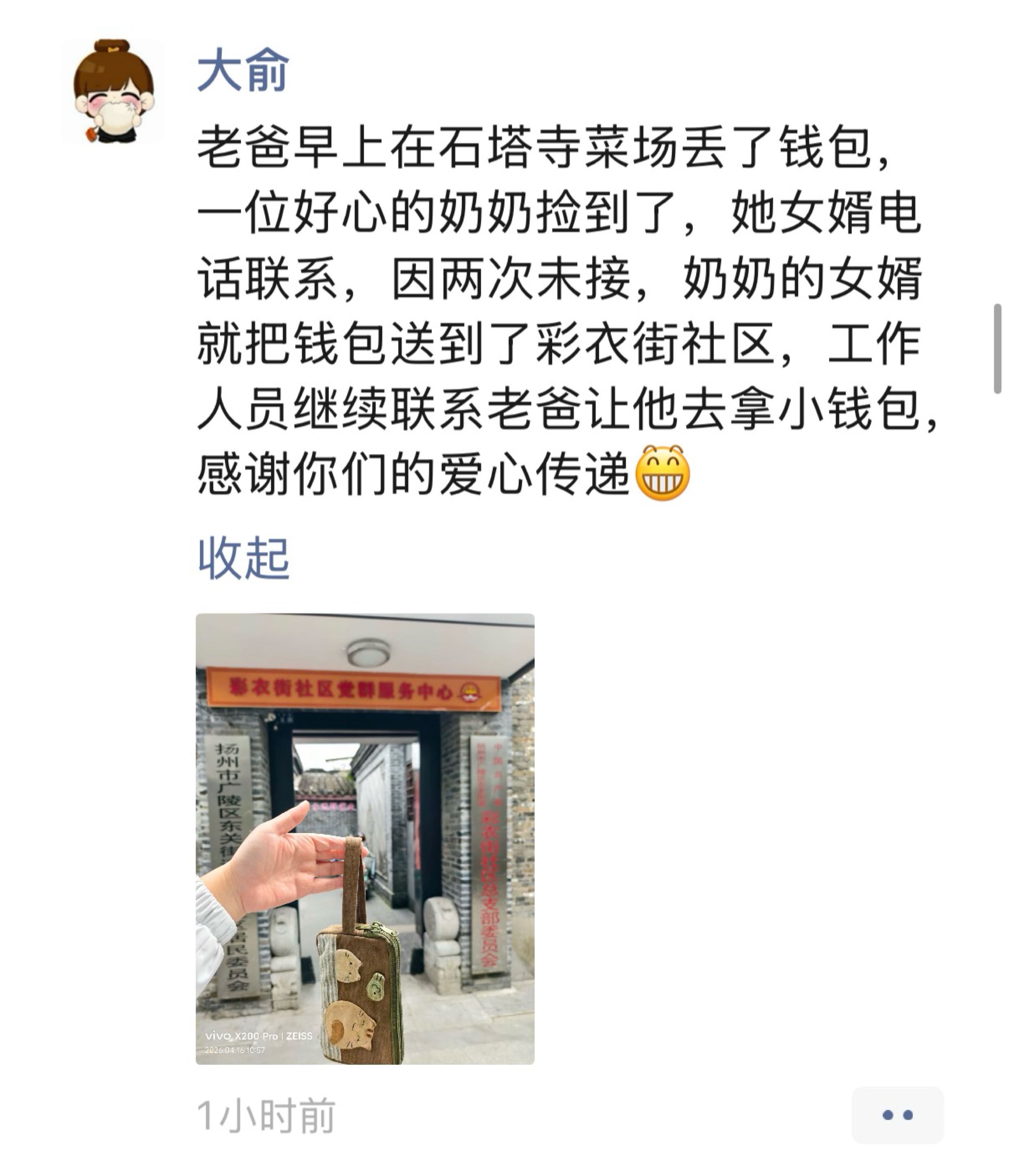 近日,扬州市广陵区东关街道彩衣街社区上演了一场温暖的爱心接力,一则失而复得的寻回故事,被失主家属发在朋友圈,字里行间满是感动与谢意,收获满满点赞。