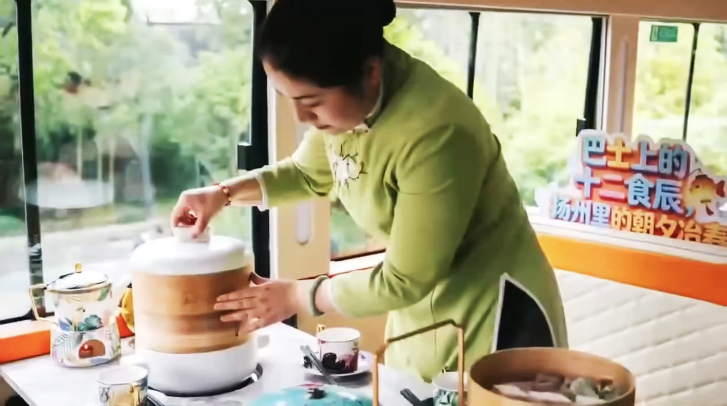 “以往游客品尝扬州早茶多为进店消费,如今我们通过空间重构,将巴士打造成为‘城市会客厅’与‘非遗厨房’,实现了‘景随车动、味随景生’的动态体验。”负责巴士改装的工作人员表示,“乘客可以一边看着‘烟花三月’的瘦西湖春水,一边吃着刚从下层厨房端上来的热腾腾的蟹黄汤包,这一模式极具市场吸引力。”