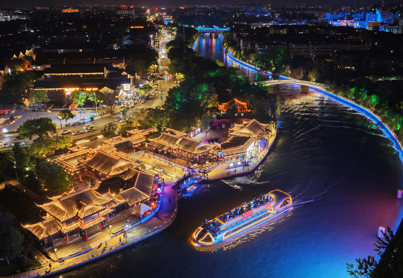 4月25日,夜幕降临,古运河两岸流光溢彩,众多游客登上游船,感受古运河的独特韵味。近年来,扬州围绕夜间经济消费热点,推出夜游、夜购等丰富多彩的新业态,提升游客夜间消费体验。 孟德龙 摄